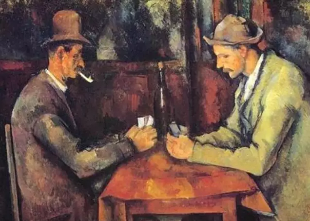 这幅画刷新了世界最贵艺术品的纪录。2012年2月,卡塔尔王室以超过2.5亿美元(约合人民币16亿)的价格买下塞尚的《玩牌者》,打破了2006年杰克逊·波洛克的《1948年5号作品》创下的1.427亿美元成交纪录,成为最贵的绘画作品。《玩牌者》为画家重要的代表作之一,画中描绘着两位玩纸牌的农民,细致地刻画出两个农民玩牌时用心思考的面部表情和弯曲的肩膀,十分生动地表现出人物的内心世界与性格特征。画家在安排布局人物与道具、环境的关系时,有意加强了轮廓线的阴影部分,并利用了不同的三角形和直角的变化,强调了棕红色调与蓝色的对比,这样既突出了主体人物,又能获得线条结构连接的稳固效果。