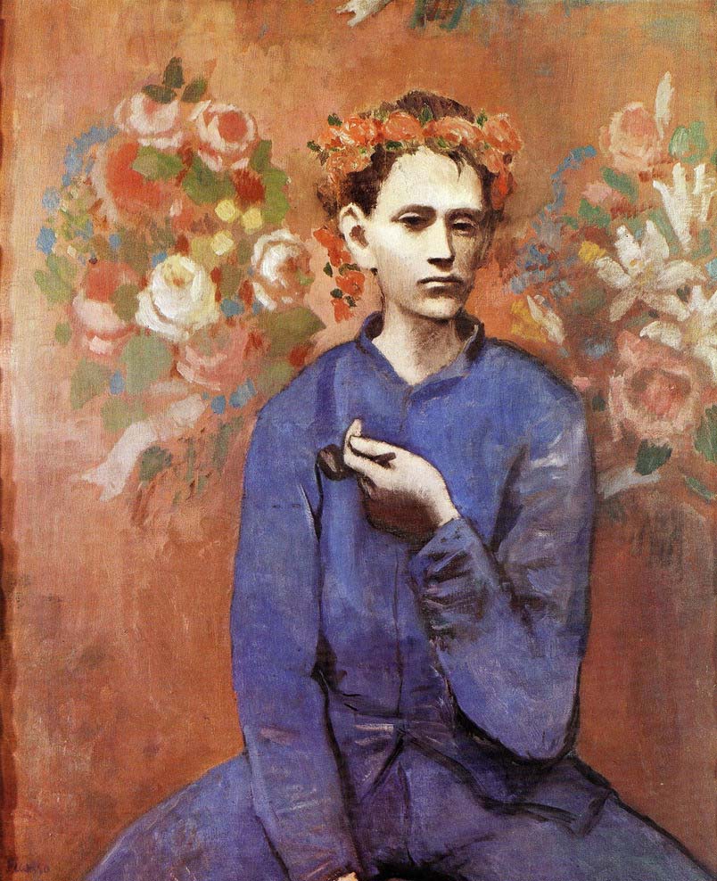 这幅画创作于1905年,是毕加索“玫瑰色时期”的代表作之一。时年毕加索24岁,刚刚在法国巴黎附近的蒙马特尔定居不久。画中年轻的巴黎男孩被毕加索称为“小路易”,他常到毕加索的画室消磨时光,毕加索以他为模特创作了这幅《拿烟斗的男孩》。画中的“小路易”穿着蓝色的工作服,左手拿着烟斗,头戴花环,背景是两大束花,看上去颇有几分中国画的味道。这画色彩清新明快,笔法细腻,人物和景致都刻画得非常生动逼真,是毕加索一生中很有代表性、也很经典的作品之一,画面集中展现了一位表情有点忧郁的青春期男孩。2004年5月5日,这幅画在伦敦举行的苏富比拍卖会上以1.0416亿美元的天价被德国的犹太富商格奥尔格先生收藏,在当时这个价位创造了世界名画拍卖史的最高纪录。