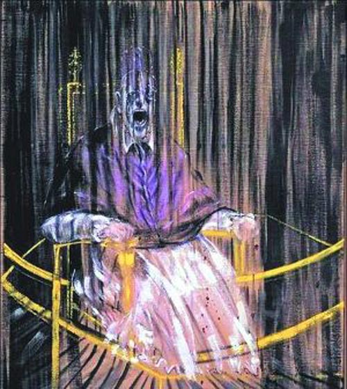 这一幅作于1953年的《教皇英诺森十世肖像的习作》,即是借用西班牙画家委拉士开兹的肖像并加以变形的作品。培根就这幅名画画了多幅变体性创作,故意让教皇英诺森十世显得滑稽可笑。在这幅画上,坐在金交椅上的教皇似乎很孤寂,为了发泄,他正伸直脖子,张着大嘴大声尖叫。画家自己说,他要"力图把某种感情形象化"。 培根的"肖像"感情的歇斯底里性质,还通过流动的油画笔触,即添上瀑布流水似的屏幕来展现。教皇的前面有展览场的围栏。他那粗犷的处理方式,令观者困惑和不安。培根经常利用英诺森十世这个历史人物形象,绝不是为了某种历史的含义,而纯粹是出自精神扰乱的寄寓性手法。这幅画拍卖的成交价为5268万美元。