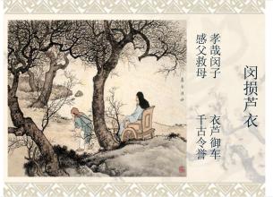 周朝的鲁国,有个姓闵名损,字子骞的人。在他很小的时候,母亲就不幸过世了。父亲娶了后妻,后妻又连续生了两个弟弟。人都有私心,因为不是自己亲生的,所以后母对待孩子就有很大的差别。后母平时对子骞很不好。严冬,后母给自己亲生的两个孩子穿着保暖的棉花做的棉衣,两个小孩子就算是在户外玩耍小脸也是红扑扑的。可怜的子骞却裹在一件单薄的芦花做成的衣服里。数九寒天,寒风刺骨,子骞经常被冻得四肢僵硬、脸色发紫。