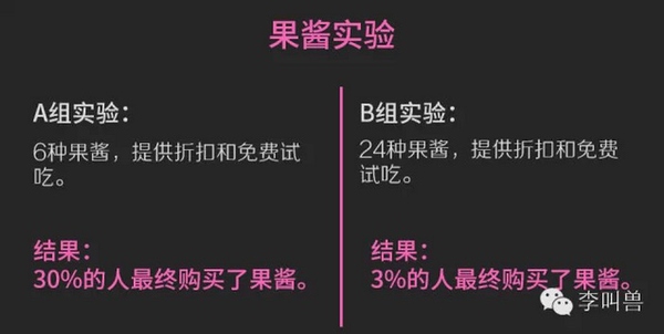 结果发现,A组中有30%的人最终购买了果酱,而B组中只有3%的人购买——都说选择多是好事,但过多的选择让B组消费者在比较的过程中心疲力竭,最终放弃了购买。