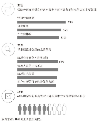 互动:当今的消费者要求保险公司提供快速、透明和个人化的互动。在我们的调研中,尽管绝大部分保险行业高管了解这些需求,但其中大部分高管并不能提供相应服务。事实上,53%的保险行业高管认为,他们并不能有效交付个性化体验,而56%的保险行业高管认为,他们不能提供成功的自助选项。除此之外,63%的保险行业高管对其全面快速处理消费者问题方面的能力并不满意。