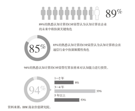 很多接受调查的通信行业领导者承认认知计算能够从根本上改变通信行业。在熟悉认知计算技术的通信行业高管中,89%的通信行业高管认为认知计算在其将来的业务中将起重要作用,85%的通信行业高管认为认知计算对于通信行业将起到颠覆性作用,而94%的通信行业高管计划对认知能力进行投资(见图10.4)。