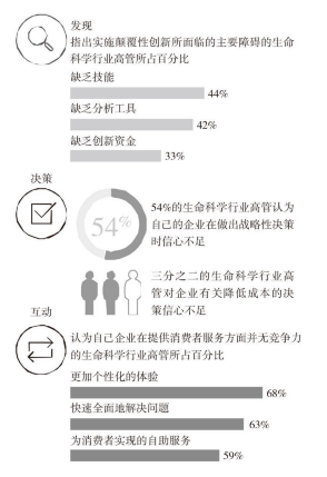 创新是生命科学企业的生命力,参与调研的大多数生命科学行业高管都在积极开展产品和服务创新。然而,他们面临着缺乏相关技能和分析工具的挑战。2015年英国进行的一项调研表明,90%的制药企业对生