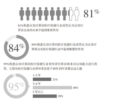 医疗保健行业高管承认认知计算能够从根本上改变医疗保健行业。在熟悉认知计算技术的医疗保健行业领导者中,84%的医疗保健行业领导者认为认知计算对于医疗保健行业将起颠覆性作用,81%的医疗保健行业领导者认为认知计算在其将来的业务中将起重要作用,而95%的医疗保健行业领导者计划对认知能力进行投资。