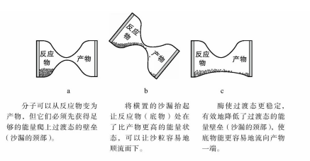 但是还有另外一种使反应物变为产物的方法,即降低反应物需要翻越的能量壁垒。这正是催化剂的工作。催化剂就像使沙漏的颈部变得更宽一样,只要有一点点的热搅动,左边的沙粒就能够流向右边(见图2-2c)。由于催化剂能改变反应中的能量壁垒,比起没有催化剂时,底物变为产物的反应速度便极大地加快了。