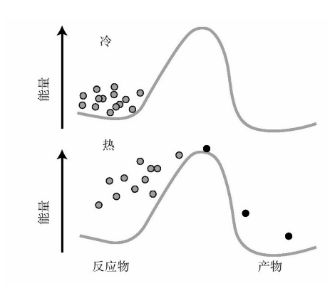 用灰色小点代表的反应物分子能够被转化为用黑色小点代表的产物分子,但它们首先需要攀上一个能量壁垒。冷的分子很少能有足够的能量来完成攀登,但热的分子可以轻易爬上顶峰。