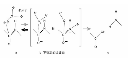 胶原蛋白之类的蛋白质由氨基酸链组成,而氨基酸链又由碳(C)、氮(N)、氧(O)、氢(H)等原子组成,并通过肽键连接(见a)。图中的肽键用粗线表示。肽键可以被一个水分子(H2O)水化,从而使肽键断裂(见c)。但在断裂之前必须要先经过不稳定的过渡态,此状态至少包括两种可以互相转化的不同结构(见b)。