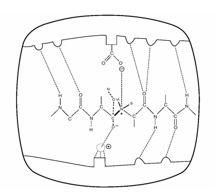 酶的活化中心如图2-4所示。通过与图2-3进行对比,我们可以发现,酶将肽键保持在了原本不稳定的过渡态,而要想使肽键断裂,必须先达到这一状态。底物由相对较弱的化学键固定(在图2-4中由虚线表示),该键本质上是底物与酶之间的共用电子对。这样的固定让底物处在一种精确的结构上,酶的分子大颚可以随时将其咬断。