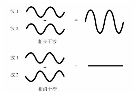 干涉条纹是波特有的性质,很容易在波的传递中观察到。比如把一块鹅卵石投入一方平静的池塘,就可以看到它激起一圈又一圈的波纹。而如果把两块鹅卵石同时投进池塘里,除了每块鹅卵石各自激起的波纹之外,在两股不同来源的波纹相交处就可以看到干涉现象(见图3-2)。如果在某个位置来自一股波纹的峰与来自另一股波纹的谷相遇,由于相互抵消,这些位置上不形成波纹:这称为相消干涉(destructive interference)。相反,当来自两股波的峰或者谷相遇,它们就相互增强:这称为相长干涉(constructive interference)。这种波与波之间相互抵消或者增强的现象发生在所有波的传递过程中。事实上,正是在200多年前英国物理学家托马斯·扬(Thomas Young)通过一个早期版本的双缝实验展示的干涉条纹,让他和同时代的其他科学家们相信光的本质是一种波。