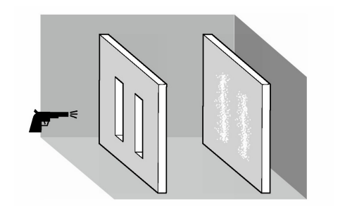 与在使用单色光中看到的波动性行为不同,向缝隙射击子弹得到的图形反映了子弹的粒子性。任何要到达第二块光屏的子弹都必须从两条缝隙的其中一条穿过(当然,这里我们假设任何不穿过缝隙的子弹都能被厚实的光屏挡住)。结果是,在后方的光屏上可以观察到对应两条缝隙分布的两列弹孔,而没有出现数列条带的干涉图形。