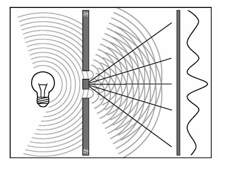 双缝实验中出现的干涉现象是由于光波具有穿过双缝传播的独特方式,这种方式被称为衍射(diffraction)。通过衍射,光波穿过两条缝隙以向外传播,如同池塘里的涟漪,来源不同的两股光波在到达第二块光屏之前也会发生交错和融合。