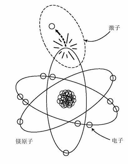 这是一个二维的叶绿素分子模型,五边形的分子主体主要由碳原子(黑色小球)和氮原子(N)围绕中间的镁原子(M)构成,分子长长的尾则主要由碳原子、氧原子(O)和氢原子(白色小球)构成。镁原子最外层的电子与原子的剩余部分只是疏松地结合在一起,通过吸收光子的太阳能,这个电子可以被激发进入周围的碳原子笼,留下一个空轨道。原先的镁原子现在带上了正电。这个空的轨道,可以被抽象地看成一个独立的整体:一个带正电的空穴(hole)。如此一来,原本电中性的镁原子在吸收光子后分成了两个部分:带正电的空穴以及带负电的激发态电子。这样的两极系统被称为激子(exciton,见图3-6),激子内同时具有正极和负极,就像一块储存有能量的小电池。