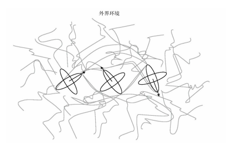 但是(注意这是一个很重要的“但是”),如果想要这台量子计算机工作,那么它的量子位在执行计算时只能与所有参与计算的其他量子位发生关联(通过看不见的纠缠态细线)。这意味着它们必须完全从所处的环境中被孤立出来。与环境存在关联的问题在于,它会让量子位与外界环境发生纠缠,我们可以把这个过程看成更多细线的建立,新绑定的细线从各个方向牵扯量子位,与量子位之间原有的细线发生竞争,干扰它们执行的计算。这个过程就是所谓的退相干过程(见图7-5)。即使与环境发生极其微弱的相互作用,量子位之间的相干性也会受到严重影响:量子位之间的量子连接被切断、纠缠态丧失,量子位的运动变为传统的比特位。