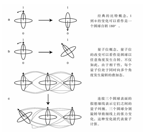 量子计算中与经典比特对应的概念叫量子位(qubit)。量子位也可以看成是一个经典的圆球[69],但是它的旋转不局限于180°。取而代之,它可以在空间里按照任意角度进行旋转,除此之外,在量子力学的范畴里,由于圆球处于量子相干叠加态,它的指针可以同时指向许多方向(见图7-4b)。灵活性上的提升让量子位可以比传统的比特编码更多的信息。不过对计算而言,真正的助力来自量子位之间的组合。