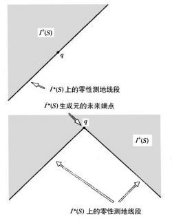 所以人们可以得到结论,除了集S本身之外未来边界是零性的。更精确地说,如果q是在该未来的边界但是不在S的闭包上,则存在一根通过q并落在边界上的过去指向的零性测地线段(见图1.3)。也可能存在不止一根通过q的落在边界上的零性测地线段,但是在那种情形下,q将是该线段的未来端点。换句话说,S的未来的边界是由这种零性测地线生成的,这种零性测地线在边界上有未来端点,如果它们和其他的生成元相交的话将要进入未来的内部。另一方面,该测地线只能在S上才有过去端点。然而,存在这样的时空,其中一个集合S的未来的边界的生成元永远不和S相交。这种生成元不能有过去端点。