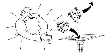 然而,这个建议不是协调的。如果黑洞具有与视界面积成正比的熵,则也应有与表面引力成正比的非零温度。考虑一个黑洞,让它和具有比黑洞更低温的热辐射相接触(图1.17)。因为根据经典理论任何东西都不能逃出黑洞,所以黑洞将吸收一些辐射而不能发射出任何东西。这样,人们就发现热量从低温的热辐射向高温的黑洞流动。因为热幅射的熵损失比黑洞的熵增加更大,所以就违反了推广的第二定律。然而,正如我们将在我下次讲演中看到的,当人们发现黑洞发射出完全热性的辐射时,协调性就被恢复了。这个结果实在太漂亮了,它不可能是一种偶合,或者仅仅是一种近似。这样看来,黑洞的的确确具有内禀引力熵。正如我即将指出的,这与黑洞的非平凡拓扑相关。内禀熵意味着引力引进了一种更高水平的不可预见性,它超越于通常和量子理论相关的不确定性之上。这样当爱因斯坦讲“上帝不掷骰子”时,他错了。对黑洞的思索向人们提示,上帝不仅掷骰子,而且有时还把骰子掷到人们看不到的地方去,使人们迷惑不已(图1.18)。