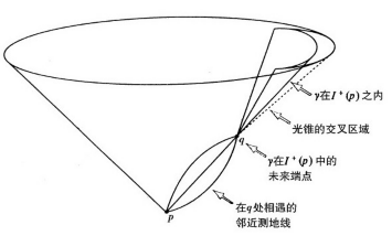 从p出发的无限邻近的测地线将在q处相交。这表明沿着连接它们的零性测地线点q和p相共轭。对于在比点q更远的γ上的点,由γ的变分可得到从ρ出发的一根类时曲线。这样在比共轭点q更远处,γ不能落在ρ的未来的边界上,因此作为ρ的未来的边界的一个生成元γ将有一个未来的端点(图1.9)。