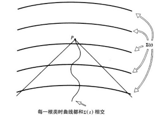 可以从以下事实看到全局双曲性的物理意义,对于U存在一族柯西面∑(t)(见图1.6)。U的一个柯西面是和U中的每一根类时曲线相交一次并仅仅一次的类空的或零性的曲面。人们从柯西面上的数据可以预言在U所要发生的事件,而且人们在一个全局双曲的背景下可以表述行为良好的量子场论。人们在一个非全局双曲的背景下能否表述一种有意义的量子场论,这一点尚未清楚。这样全局双曲性也许在物理上是必须的。但是,我的观点是我们不应这么假想,因为这样做也许会排除掉引力要告诉我们的某种东西。我们宁愿从其他物理上合理的假设推导出时空的某些区域是全局双曲的。