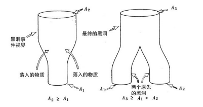 图1.16 当我们把物质抛入黑洞,或者允许两个黑洞合并时,事件视界的总面积永不减小。