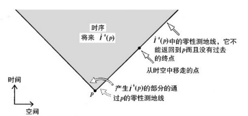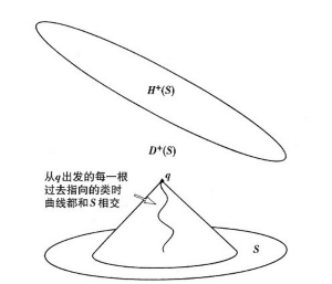 我们现在考虑一个集合S的未来的边界I+(S)。可以相当容易看出,这个世界不能是类时的。因为在这种情形下,一个恰好在边界之外的点可以是一个恰好在里面的点p的未来。未来的边界也不能是类空的,除了刚好在集S上的除外,因为在那处情形下,从刚好在边界未来出发的每一根过去指向的曲线都会穿越过边界并且离开S的未来,这就和q是在S未来中的事实相冲突(图1.2)。