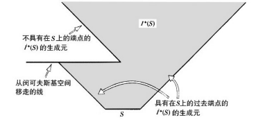 图1.4 由于从闵可夫斯基空间移走了一根线,集S的未来的边界具有一根没有过去端点的生成元。