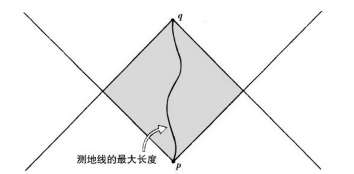 图1.7 在全局双曲空间中,存在一根测地线,它的长度在所有两点的类时或零性曲线中取极大值。