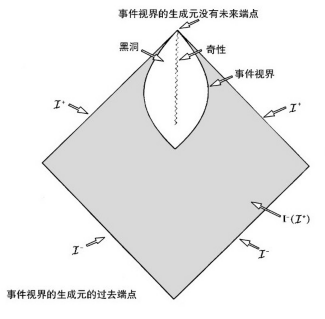 如果弱宇宙监督成立的话,则被预言的在引力坍缩中发生的奇性就从I+看不到。这就意味着时空中必须有一区域,它不在I+的过去中。因为光或者任何东西都不能从这个区域逃逸到无穷去,所以它被称为黑洞。黑洞区域的边界被称为事件视界。因为它也是I+的过去的边界,事件视界由零性测地线段所生成,这线段可有过去端点,但是不能有任何未来端点。这样,如果弱能量条件成立的话,视界的生成元就不能收敛。因为如果它们收敛的话,它们将在有限的距离内相交。