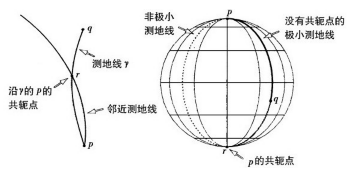 图1.8 左:如果在测地线上的p和q之间存在有共轭点r,它就不是具有极小长度的测地线。右:从p到q的非极小测地线在其南极具有共轭点。