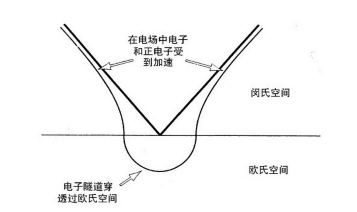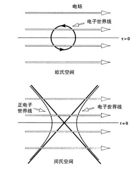 一个强电场中能产生带正负电荷的粒子对,人们知道这个事实已有相当长的时间了。一种看待这个现象的办法是注意到,一个具有电荷q的诸如电子的粒子在平坦的具有均匀电场E的欧氏空间中的运动轨道是一个圆周。人们可以把这个运动从虚时间τ向实时间t作解析连续。他就会得到一对带正负电的粒子,由于电场的拉力被相互分开而加速飞离(图3.11)。