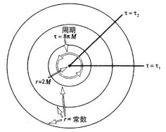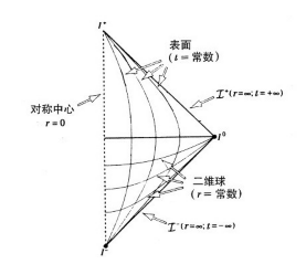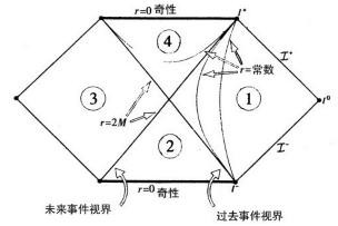 其卡特彭罗斯图具有两头被切平的金刚石形状(图3.4)。它被在r=2M的两个零性面分割成四个区域。右边的在图中被标为①的区域是渐近平坦的空间,我们就假定生活在此。正如平坦时空的情形,它具有过去和未来零性无穷I-和I+。左边还存在另一个渐近平坦区域③,它只能通过一个虫洞和我们的宇宙相连结。然而,正如我们将会看到的,它是通过虚时间和我们的区域相连接。从左下端到右上端的零性面正是我们从那儿能逃逸到在右边的无穷的区域的边界。这样,它是未来事件视界,修饰词未来是用来和从右下端到左上端的过去事件视界相区别。