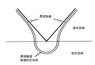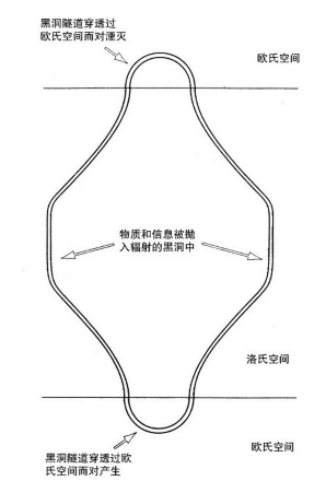 图3.15 还可以利用半张欧氏图和半张洛氏图的连接来描述一对黑洞的隧道穿透的产生。