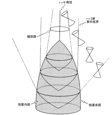 图3.1 一个恒星坍缩形成黑洞的时空图,图上标出事件视界和闭合捕获面。