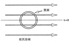 1976年恩斯特找到了一个代表在磁场中的两个带磁荷的相互加速离开的黑洞的解(图3.13)。黑洞在弯曲的欧氏空间沿着一个圆周运动,正如同在平坦的欧氏空间电子沿着一个圆周运动一样(图3.14)。因为虚时间不仅在围绕黑洞的视界而且在围绕黑洞运动的圆周的中心都是周期性的,所以引起了复杂性。人们必须调整黑洞质荷比使这两个周期相同。在物理学上,这表明人们应这样选取黑洞的参数,使得黑洞的温度和由于加速而呈现的温度相等。随着磁荷趋近于在普朗克单位下的质量,黑洞的温度趋近于零。这样,在弱磁场中,在低加速时,人们总可以使两个周期相配合。