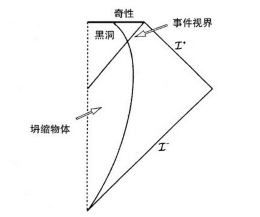人们从图上可以容易看到,闵可夫斯基空间中的每一点都是在未来零性无穷I+的过去中。这表明不存在黑洞和事件视界。然而发生球对称物体坍缩的话,图就相当不一样了(图3.3)。它在过去看起来是相同的,但是现在三角形的顶被切去了,而且用一个水平的边界来取代。这便是霍金彭罗斯定理所预言的奇性。现在人们可以看到,在这根水平线之下有些点不是处于未来零性无穷I+的过去。换句话说,存在有黑洞。其事件视界,也就是黑洞边界是从右上角下来的斜线,并和对应于对称中心的垂直线相交。