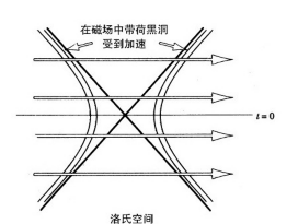 图3.13 在磁场中,一对带相反磁荷的黑洞相互加速飞离。