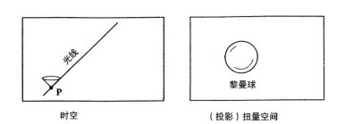 扭量理论的基本观念是试图开发这种在量子力学和时空结构中的联系——正如在黎曼球中所显示的——把这个观念推广到整个时空。我们将要把整个光线当成甚至比时空点更基本的对象。这样,我们把时空认为是从属的概念,而把扭量空间——原先是光线空间——认为是更基本空间。这两种空间由一种对应相关联,时空中的光线在扭量空间中用点来代表。而时空中的点用通过它的光线集合来代表。这样,时空中的一点在扭量空间中变成为一个黎曼球。我们应该把扭量空间当作按照它来描述物理的空间(图6.4)。