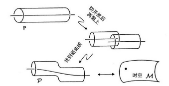 然而,我们希望能够对付更一般的时空。对于一个具有反自对偶外尔张量(也就是外尔张量的自对偶一半为零)的复化(或欧氏化)的时空M,存在一个构造——所谓的非线性引力子构造——能充分地讨论这个问题(彭罗斯1976)。让我们看这是怎么进行的。取一根线的管状领域,或者类似的某些东西(例如上一半或正频部分PT+)组成的扭量空间的一部分,而且把它切成二个或更多个小块,然后把它们粘在一块,只不过相对之间移动一些。一般来说,在原先空间P中的直线在新空间中p断开。然而我们能寻找新的解析曲线去取代原先(现在断的)直线,假定这些曲线光滑地接在一起。假定从P到p的变形不是太大,用这种办法得到的解析曲线和原先的线——属于同样的拓扑的族——形成一个四维的族。代表这些解析曲线的点的空间是我们反自对偶(复的)“时空”M(图6.5)。现在我们能把爱因斯坦真空方程(里奇平坦性)编码成必须是在投影线CP1上的一个解析纤维化的条件(以及其他一些缓和条件)。只要把p和P变形表达成自由解析函数就可以达到这一切,而在原则上弯曲时空M的所有信息都被编码在这些函数之中(虽然在p上找到所需要的解析曲线可能是很困难的)。