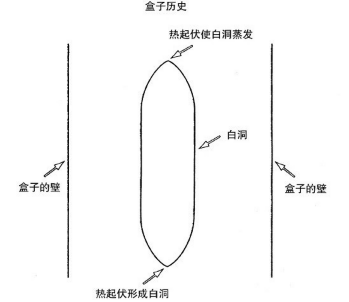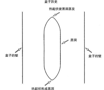 关于我们第二个争议,我相信黑洞的出现和消失是时间对称的。那就是,如果你对盒子录影,再倒过来放,会显得是相同的。在时间的一个方向,你看到黑洞出现并消失。在另一个方向,你看到白洞——黑洞的时间反演——出现并消失。如果白洞和黑洞相同的话,这两个图像可以相同。这样,没有必要因为盒子的行为而去求助CPT的违反(图7.3)。