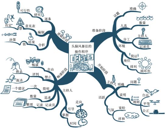 此处可作为思维导图的二级分支。头脑风暴成功的关键是探讨方式以及放松心理压力等。要在一个公平公正的情况下,才能无差别地交流,思想碰击也就更大了。