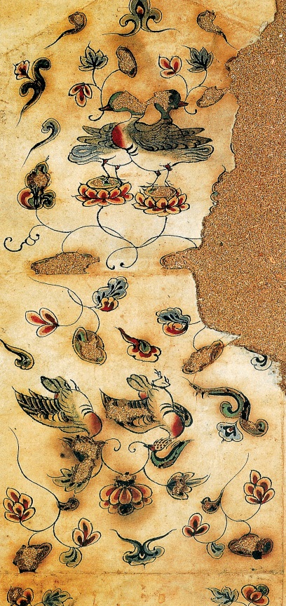 此作品于1968年在新疆吐鲁番被发现,画面由上、中、下三部分组成。上面绘两只鸳鸯嘴中各衔一技花卉,分立于两朵莲花上,周围用彩云衬托。中间部分绘两只鸳鸯共衔一技花卉,飞翔于花和云之间。下部尚未完成。此图造型生动,用线流畅,技法纯熟。