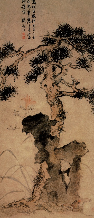 陈淳(1483-1544),字道复,长洲(今江苏苏州)人。擅长水墨写意,尤精写生。师从文征明,但不拘前人之法,独树一帜,与除渭齐名,并称“青藤白阳”。为明代文人画中写意花鸟派之代表。此图绘松树、湖石、萱花各一。构图饱满,松树用笔苍劲,湖石皴染结合,萱花勾写兼用,画法多变,显示出画家精湛的笔墨功夫。陈淳的花鸟画重写意韵,意足不求形似的作风,很受文人推崇。