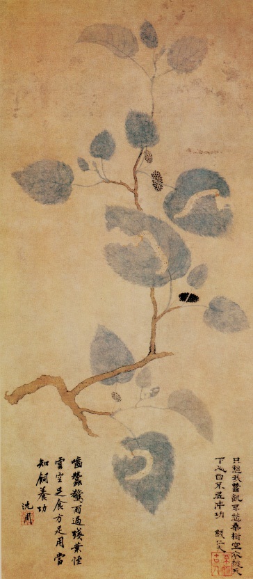 此图画桑树干一枝,桑叶上有几条蚕正在取食桑叶。桑叶用没骨法,以花青画叶面,花青略加赭石画叶背,枝干先勾勒后填赭石。风格清疏淡雅。