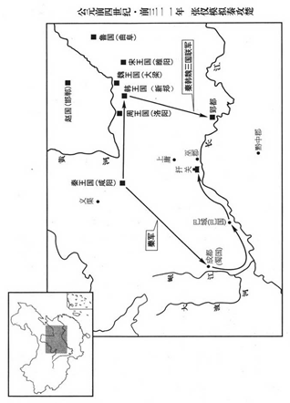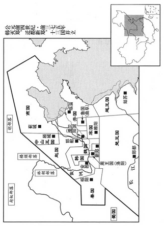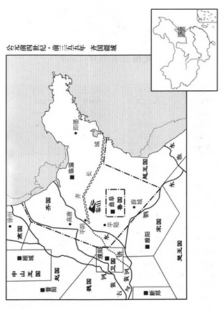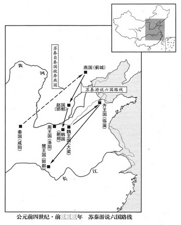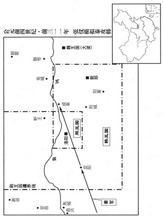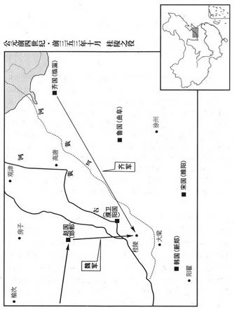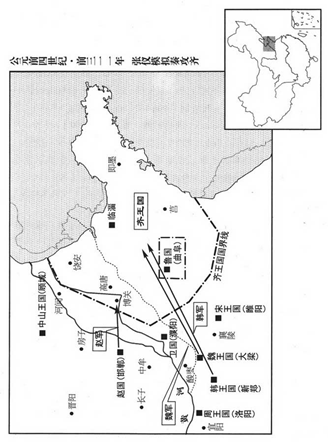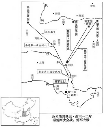1魏国(首府安邑【山西省夏县】)、韩国(首府平阳【山西省临汾市】)、赵国(首府晋阳【山西省太原市】),联合攻击楚王国(首都郢都【湖北省江陵县】),大军进抵桑丘(《史记》作乘丘【山东省兖州市西北】)。