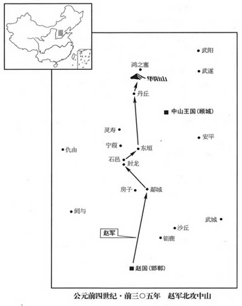 2赵国(首府邯郸【河北省邯郸市】)进攻中山王国(首都顾城【河北省定州市】),陷丹丘(河北省曲阳县西北)、华阳(河北省涞源县南航空距离四十千米)、鸿之塞(河北省涞源县南,航空距离三十千米)。占领鄗城(河北省柏乡县北)、石邑(河北省石家庄市)、封龙(石家庄市西南【石邑南】)、东垣(河北省石家庄市东北)。中山王国恐慌,割让四个城市给赵国,求和。
