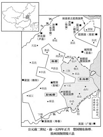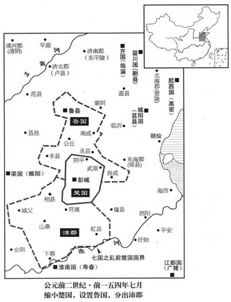 6楚王(首府彭城【江苏省徐州市】)刘戊(音wù【务】)到长安朝见,晁错弹劾刘戊:去年(前一五五年)太皇太后薄女士逝世,守丧期间,他在私宅跟女人上床,应依法斩首。刘启下令赦免死刑,仅削去东海郡(山东省郯城县)。于是,晁错开始一连串打击行动,追查前年(前一五六年)赵王(首府邯郸【河北省邯郸市】)刘遂,曾犯过失(没有指出什么过失),削去常山郡(河北省正定县)。再追查胶西王(首府高密【山东省高密县】)刘卬(音áng【昂】),在执行政府卖官事件上,舞弊诈欺,削去六个县(后改置北海郡【山东省昌乐县东南】)。