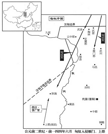 1冬季,匈奴汗国(王庭设蒙古国哈尔和林市)大举南下,三万人攻入西汉王朝(首都长安【陕西省西安市】)上郡(陕西省延安市),三万人攻入云中(内蒙古托克托县),屠杀掳掠,损失惨重,烽火直抵甘泉(陕西省淳化县西北),首都长安(陕西省西安市)震动。(烽火台,乃古代的人造卫星,专门传递军事上紧急情况。从首都作放射形状,分别通往边疆或各封国,每隔十千米或十五千米,建筑高大的碉堡。碉堡上除了战士日夜二十四小时轮班眺望外,还储备木柴和狼粪。夜间燃起木柴,谓之烽火;白天燃起狼粪,谓之狼烟。据说,狼粪的烟,比较有凝聚力,直冲天际,不容易被风吹散。如果敌人发动攻击,烽火台燃起烽火狼烟,消息会很快传到首都,中央就可发兵赴援。如果首都有难,各封国也可以立刻得到消息,起兵勤王。)