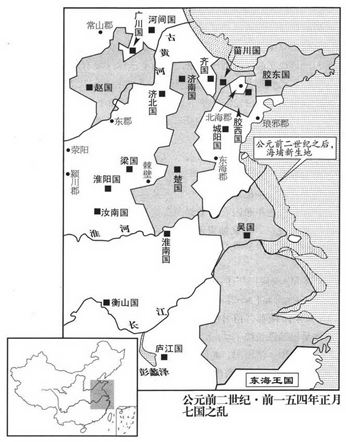 等到刘启即位,晁错再提建议,说:“当初,高皇帝(刘邦)平定天下,因为兄弟太少,儿子们年纪又幼,大封亲属时,封国都很大。齐国(首府临淄【山东省淄博市东临淄镇】)七十余县(辖临淄郡、济北郡、博阳郡、城阳郡、胶东郡、胶西郡、琅邪郡),楚国(首府彭城【江苏省徐州市】)四十余县(辖彭城郡、东海郡、薛郡),吴国五十余县(辖东阳郡、吴郡、鄣郡)。这三个封国的国君,不是庶子,就是疏族,却分去了一半天下。而今刘濞因为衔恨他儿子死亡的往事,假装害病,不来朝见,依照古代法律,应该诛杀。先帝(刘恒)不忍心那样做,反而赏赐给他茶几、手杖,恩德太厚,按理他应该自己检讨,改过自新,想不到反而促使他更加骄横。开矿山铸钱,煮海水制盐,引诱天下亡命之徒,阴谋作乱。削减他的土地,他固然反;就是不削减他的土地,他也会反。现在就行动,他反得快,但祸小;现在不行动,他反得迟,但祸大。”