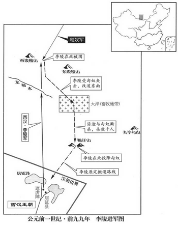3当初,李广的孙儿李陵,当宫廷随从(侍中),骑马射箭,无不精通,尤其厚爱自己的部属。刘彻认为有祖父的风范,命他当骑兵总监(骑都尉),统御丹阳郡(安徽省宣州市)和楚国(首府彭城【江苏省徐州市】)战士五千人,在酒泉郡(甘肃省酒泉市)、张掖郡(甘肃省张掖市)驻防,加强射击训练,戒备北方的匈奴。正逢贰师将军李广利出击匈奴,刘彻把李陵召到长安,命他保护贰师兵团的后勤补给路线。李陵叩头请求出战,说:“我所率领的官兵,都是楚国一带的勇士、奇才、剑客,力量可以扼死猛虎,射箭百发百中。愿意投入战场,独当一面,向兰于山(今地不详)由方挺进,分散匈奴的注意,不让匈奴集中力量专对贰师兵团。”刘彻说:“你是不是不愿当别人的部下?这次动员的军队太多,可没有马配给你。”李陵说:“用不着马,我愿以少击众,用五千步兵,踏平单于的王庭(蒙古国哈尔和林市)。”刘彻为他的凌云壮志感动,答应他的请求。
