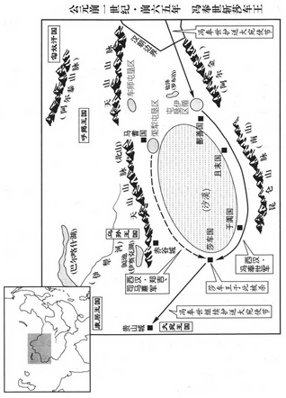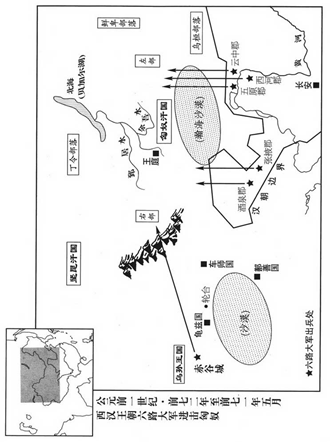 6车师王(新疆维吾尔自治区吐鲁番市)乌贵逃到乌孙(首都赤谷城【中亚伊赛克湖东南中国边境】。参考前六七年),乌孙王国不让他走。西汉政府派使节前往责问,乌孙才把他送到长安。